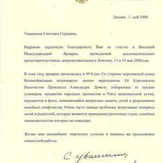 2008 - Main organizer of the exhibition of applied arts of the Russian Federation from the Embassy of the Russian Federation to the Foreign Office (noted with gratitude by the Ambassador of the Russian Federation to Great Britain Yuri Fedotov)